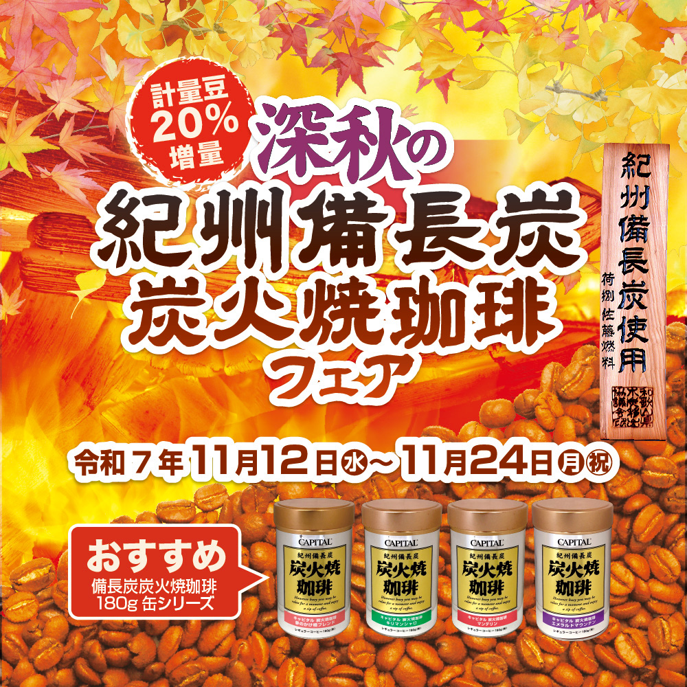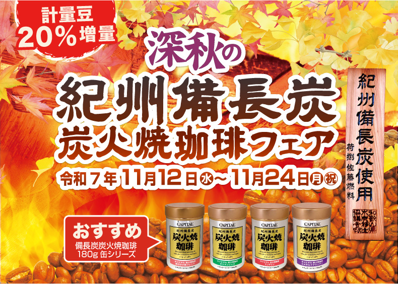 キャピタルコーヒーでは、11月12日(水)より紀州備長炭「秋の炭火焼珈琲フェア」を開催いたします。