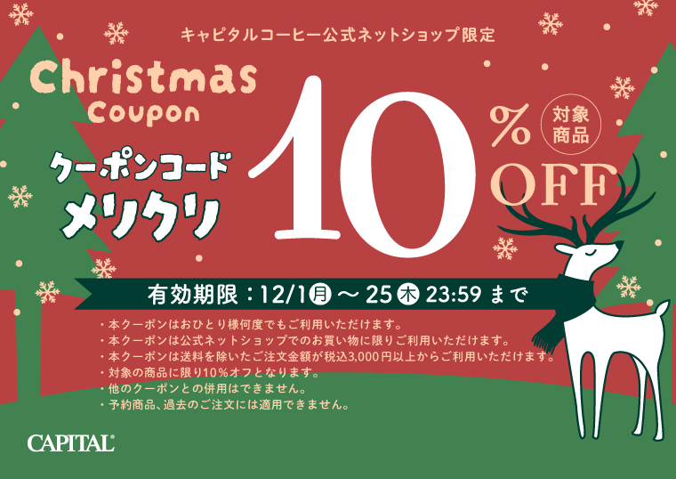 キャピタルコーヒーからのクリスマスプレゼントとして、キャンペーン期間中、キャピタルコーヒー公式ネットショップ限定でご利用できるクーポンを配布いたします。