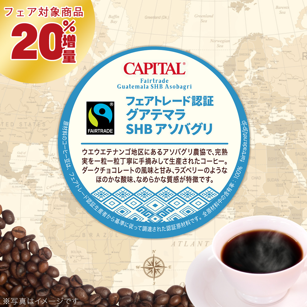 社会的、環境的、経済的基準について定めた国際フェアトレード基準を満たし、国際フェアトレード認証ラベルが付いた、3種のコーヒーを20%増量セール!